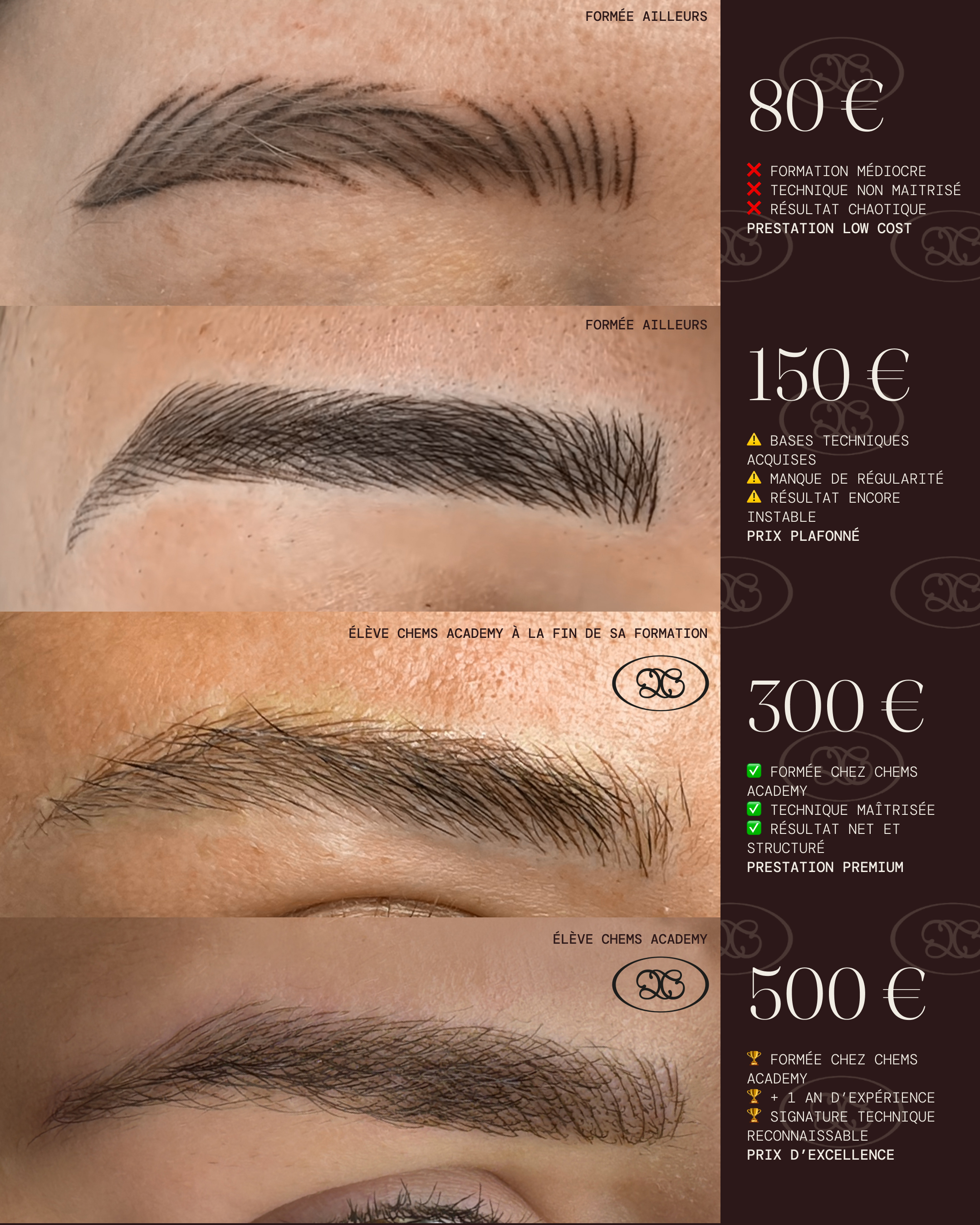 Une formation de 2 jours sur Lyon, vraiment très bien, une équipe bienveillante, un suivi de 6 mois très sérieux (pour l'obtention du diplôme). Être formée par Chems Latreche, c'est tout simplement acquérir la meilleure technique dans le maquillage du sourcils, que l'on ne voit nulle par ailleurs ! JUSTE QUE DU BONHEUR